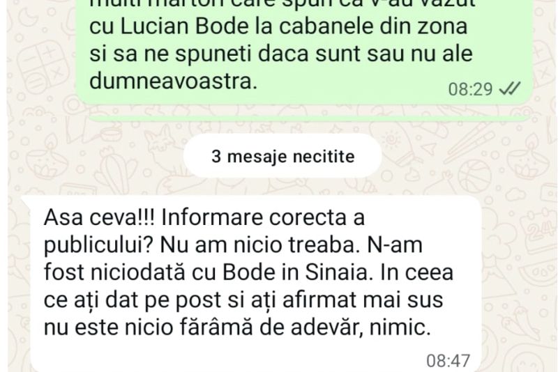 "Pentru informarea corectă a publicului, vă invităm să mergeți împreună cu o echipă Realitatea Plus la Sinaia, pentru a filma, deoarece avem mai mulți martori care spun că v-au văzut cu Lucian Bode la cabanele din zonă și să ne spuneți dacă acestea vă aparțin sau nu".