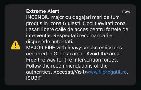 Având în vedere degajarea intensă de fum, a fost emis un mesaj prin sistemul Ro-Alert pentru avertizarea și informarea populației